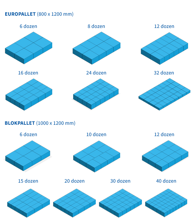 * Blok: Aantal dozen die per laag op een blokpallet (blok) van 1000 x 1200 mm passen.