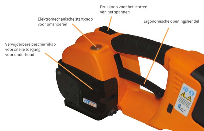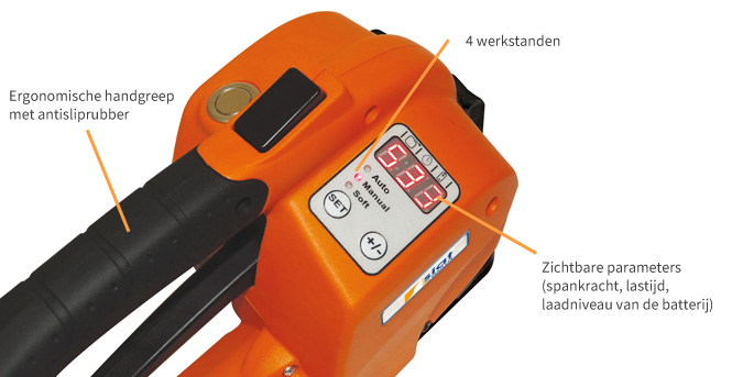 Compact en ergonomisch omsnoeringsapparaat voor automatisch omsnoeren van PP en PET omsnoeringsband. 3 in 1: toestel spant de band aan, last en snijdt af.
